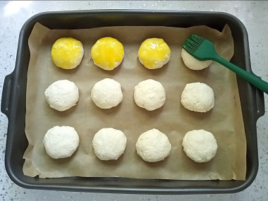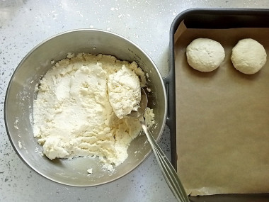 Слепите сырники, выложите их на застеленный пергаментом лист. По необходимости смажьте пергамент растительным маслом.