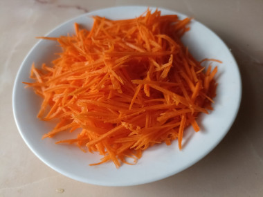 Морковь промойте, очистите и натрите на терке для моркови по-корейски. Если такой терки у вас нет, то можно нарезать морковь ножом тонкой соломкой иои просто натереть на крупной терке.