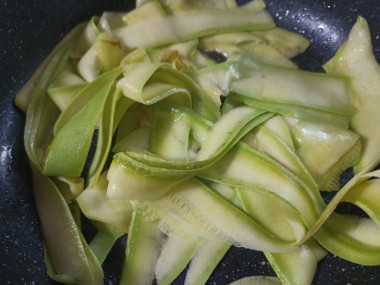 В сковороде на небольшом огне разогрейте растительное масло. Выложите кабачковую лапшу и обжарьте около 2 минут. За это время кабачки пустят сок и немного осядут. О том, как подобрать идеальную сковороду, а также как правильно выбрать растительное масло, читайте в отдельных статьях, ссылки в конце рецепта.