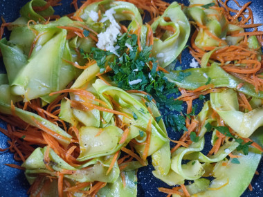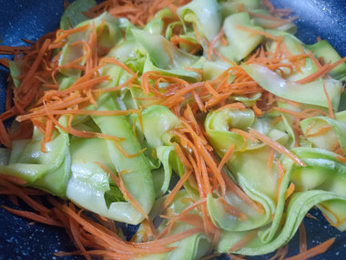Затем выложите в сковороду тертую морковь. Все аккуратно перемешайте, стараясь не повредить кабачковую лапшу. Потушите все вместе 1-2 минуты.