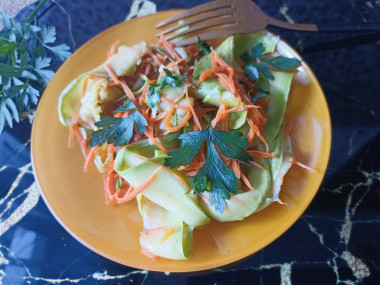Приготовила лапшу из кабачков на сковороде. Молодой кабачок нарезала с помощью овощерезки тонкими слайсами, морковь натерла, измельчила чеснок и зелень петрушки. Обжарила на сковороде с растительным маслом кабачок ,чтобы он стал мягче, но не потерял упругость, затем добавила натёртую морковь, обжарила вместе две минутки, посыпала салат солью, перцем, зеленью петрушки и чесноком. Салат получился сладковатый, мне захотелось добавить немного кислинки, сбрызнула его лимонным соком. Вкусный и полезный салатик получился. Спасибо за рецепт, Мария!