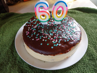 Мне понравился в коржах хрустящий мак. Крем получился нежный, в меру сладкий. Правда, у меня получилось так, что крем полностью покрыл бока торта, а не остался прослойкой между коржами. Наверное, форма недостаточно плотно прилегала к торту. Украшение выбирала дочка. Она решила, что для дедушкиного торта подойдет кондитерская посыпка в виде кружочков.
