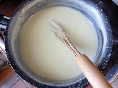 При постоянном помешивании тонкой струйкой влейте получившуюся смесь в горячее молоко. Варите крем, постоянно помешивая венчиком, до загустения. Я уваривала до тех пор, пока след от венчика перестал затягиваться. Чем гуще будет крем, тем более ровным будет разрез торта.