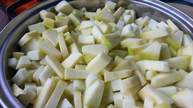 У меня кабачки молоденькие, шкурка у них еще мягкая, я нарезаю кабачки, не очищая их. Нарежьте кабачки кубиками среднего размера. Переложите нарезанные кабачки в кастрюлю или другую посуду, в которой будете варить варенье.