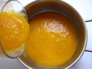 Затем все измельчите любым удобным способом. Можно пропустить через мясорубку, измельчить в стационарном блендере или воспользоваться погружным. Верните измельченную массу на огонь и проварите еще минут 10-15. Если будет появляться пенка, её необходимо снять. Чем дольше абрикосы будут вариться, тем гуще получится повидло.