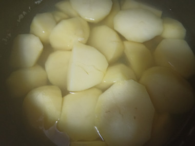 Картошку помойте, очистите, отварите в подсоленной воде до готовности в течение 15-20 минут. Слейте воду, а картошку разомните толкушкой в пюре.