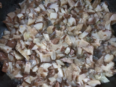 Зеленый лук обмойте и мелко нарежьте. Грибы промойте, обсушите и нарежьте мелким кубиком. Маринованные или соленые грибы также нужно промыть и откинуть на дуршлаг, чтобы с них стекла лишняя влага. На сковороде разогрейте масло и слегка обжарьте лук, затем добавьте грибы, перемешайте и обжаривайте всё вместе 10-15 минут.
