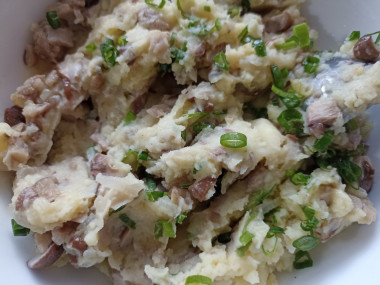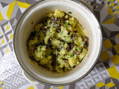 Добавьте к картошке обжаренные с луком грибы и перемешайте.