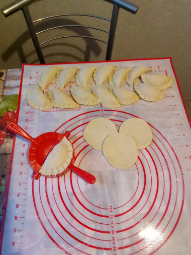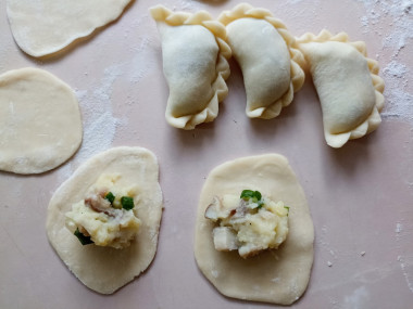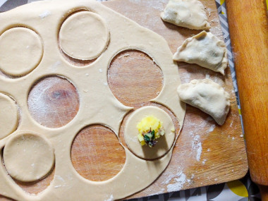 На середину каждого кружочка выложите начинку. Защипите края, формируя вареники.