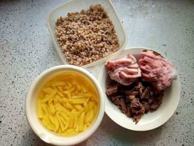 Сегодня на обед приготовила солянку с перловкой. Вообще мне нравятся разные виды солянок, единственное что не люблю оливки, поэтому не добавляю их. Этот рецепт выбрала потому, что состав напоминает рассольник, а его любят мои дети). Приготовление начала с вечера, отварила перловку и сварила бульон на говядине с косточкой. Утром отделила мясо и нарезала. В качестве мясных добавок взяла замороженную колбасу и бекон. Я часто замораживаю остатки разных мясных изделий как раз для солянки. Солёные огурцы не стала резать, натерла на крупной терке и потушила с томатной пастой. Потом все проварила на медленном огне, чтобы картошка, перловка и мясо хорошо пропитались томатом и огуресным рассолом. Такой наваристый суп получился, просто чудо! Очень сытный, ароматный, в нём много разных вкусов.