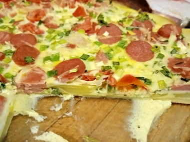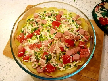 Киш я делала в широкой стеклянной форме. Для основы взяла три средних картошки, нарезала их тонко. Возник вопрос: промывать или нет? Решила, что не нужно промывать, чтобы ломтики лучше "склеились". Разложила их в нахлест, посыпала специями и запекла 20 минут. Для начинки вместо ветчины взяла сосиски и бекон. Помидоры из заморозки, обдала их горячей водой, чтобы растаяли. Начинку не солила, т. к. продукты, входящие в неё и так солёные. Потом разложила начинку на картофель и запекала ещё 25 минут. Яично-сливочная смесь стекла на картофель и образовала настоящую основу "запеканки". А начинка запеклась сверху. Получился невероятно вкусный и ароматный картофельный киш! Думаю, можно ещё поэкспериментировать с начинками. Кусочки при нарезании не разваливаются в горячем виде, это большой плюс. Вся семья осталась сытой и довольной.