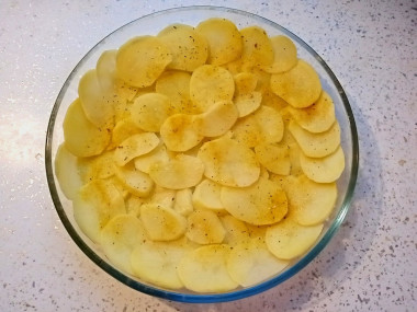 Форму смазываем растительным маслом, дно и бока присыпаем панировочными сухарями. Выкладываем картофель на дно формы, делая из части кружочков бортики. Солим и перчим картофель, можно сбрызнуть оливковым маслом. И ставим в духовку, разогретую до 180 градусов на 15 минут.