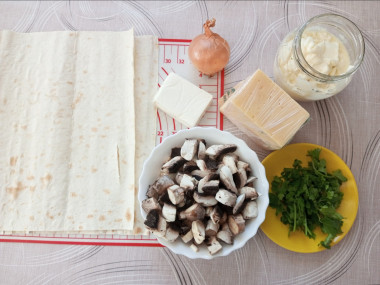 Готовим третий ролл. Для начинки понадобятся свежие шампиньоны, лук, петрушка, плавленый и твердый сыр (50 гр), соль, смесь перцев, майонез (4 ст ложки). Грибы помойте и мелко нарежьте. Также мелко нарежьте лук и петрушку.