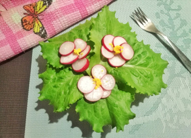 В качестве салатника берем небольшую пиалу, похожую на цветочный горшочек, или стеклянные салатники. Сверху выкладываем листочки шпината (по кругу). В середину выкладываем из кружочков редиса цветочки, в центр каждого кладем немного яичного желтка. Подаем салат к столу. Получается довольно-таки быстро, просто, красиво и вкусно. Можно салат разложить в небольшие персональные чашечки, чтобы у каждого гостя был свой «горшочек с фиалкой». Приятного аппетита!
