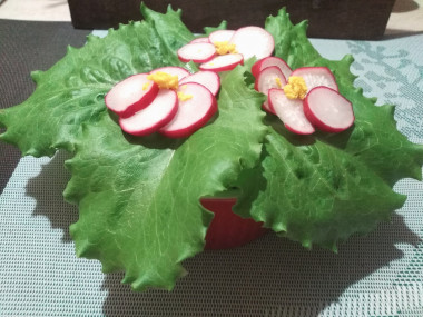 Из простых продуктов получился очень вкусный салатик. Все ингредиенты нарезала кубиками небольшого размера и заправила соусом, как советует автор. После того, как салат пропитался, я начала оформление. Это заняло считанные минуты, а выглядит салат очень эффектно. Разложила салатик в кокотницы диаметром 10 см. Уложила листья салата и сделала из кружков редиса "фиалки" с серединкой из желтка. Ну, просто нет слов! Великолепное оформление и такое простое! Получились каждому порционные "горшочки с фиалками". Класс!