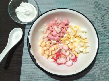 Пару редисок мелко режем. Остальные оставляем для оформления салата. Их нам нужно нарезать тонкими кружочками.