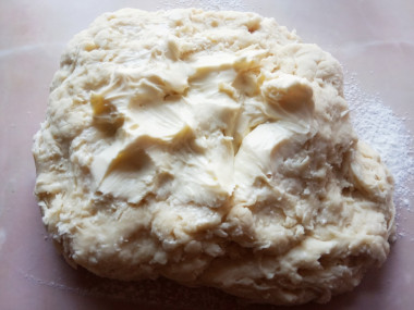 Оставшуюся муку высыпьте на стол и продолжайте вымешивать тесто до гладкости. Добавьте мягкое сливочное масло и вымешивайте еще 5-7 минут до однородности, мягкости и эластичности, при необходимости подсыпая понемногу еще муки. Если тесто все еще липнет, а муки требуется еще больше, чем по рецепту, лучше не забивайте его мукой, иначе в готовом виде выпечка получится слишком плотной и невкусной. Лучше добавьте муку потом при формовании булочек.
