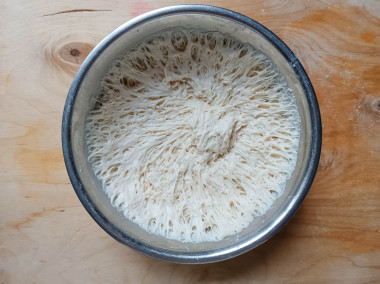 Миску накройте пищевой пленкой, сверху салфеткой. Оставьте в тепле примерно на 2,5 часа. Опара должна подняться пышной шапкой и вот-вот начнет опускаться.