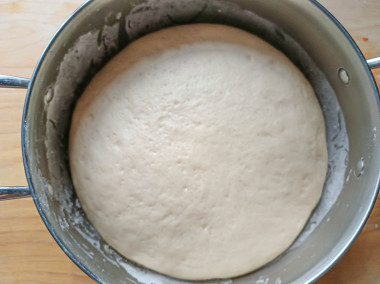 Тесто получилось мягкое и эластичное. При замесе оно совсем немного липло к рукам, но некритично. Даже руки не пришлось смазывать растительным маслом. После подъема (у меня на это ушло около 2,5 часов) тесто совсем перестало липнуть.