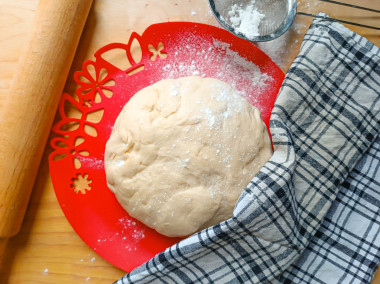 Чистую глубокую миску легко смажьте растительным маслом без запаха. Поместите округленное тесто, накройте пленкой и салфеткой и оставьте подходить на 1,5 - 2 часа в теплом месте без сквозняка. У меня тесто подходит в едва теплой выключенной духовке, температура 25 - 35 градусов не выше.