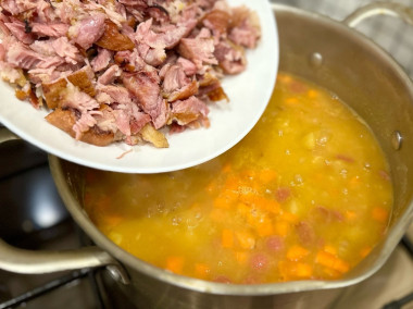 Если же вы решите использовать цельный горох, то его стоит замочить на пару часов или даже на ночь, чтобы ускорить процесс варки и избежать жесткости. А так как в этом рецепте мы используем именно колотый горох, замачивание не требуется.