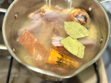 Добавьте в суп зажарку, положите в него перец горошком и лавровый лист. Дождитесь закипания супа, прокипятите его пару минут. Затем огонь выключите, накройте кастрюлю крышкой и дайте гороховому супу с копчеными свиными ребрышками немного настояться и подавайте к столу.