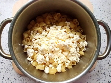 Следом добавьте в макароны творог.