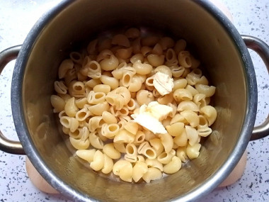 Добавьте в горячие макароны сливочное масло и хорошо перемешайте.