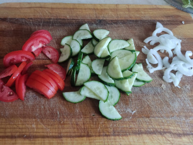 Помидоры порезала дольками,лук полукольцами, огурцы полукружками,сыр кубиками.