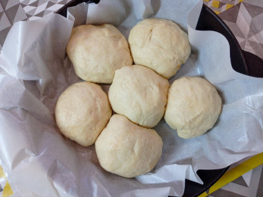Перед выпечкой необходимо булочкам дать постоять в форме минут 15 для подхода, затем смазать поверхность желтком. Чем еще можно смазать тесто перед выпечкой читайте в отдельной статье в конце этого рецепта.