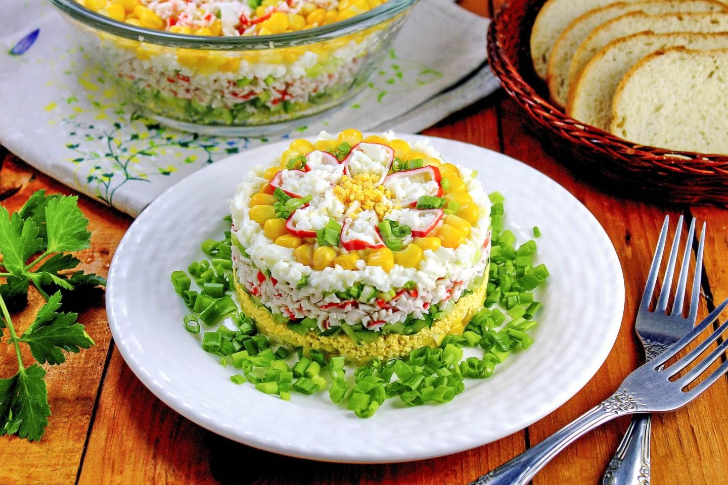Салаты на основе крабовых палочек (сурми) стали популярны в странах СНГ в 90-х годах как доступная и праздничная альтернатива блюдам из морепродуктов. Сочетание с консервированной кукурузой и свежими овощами — это классика постсоветской кухни, которая полюбилась за простоту, яркий вкус и универсальность.