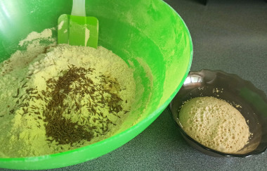 Добавьте в муку растительное рафинированное масло, соль и тмин.