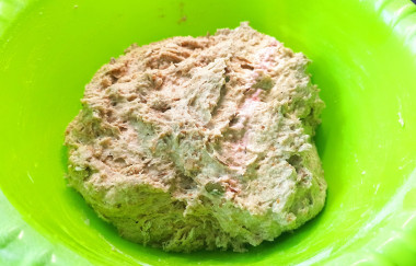 Через час подошедшее тесто обомните руками, чтобы выгнать углекислый газ, препятствующий процессу брожения. Для того чтобы тесто сильно не прилипало, смочите руки в воде или смажьте растительным маслом.