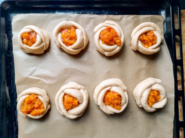 Теста получилось много, очень много! Кураги у меня было 200 граммов. Вместо абрикосового варенья добавила малиновое. Начинки мне хватило на 8 булочек (сформировала их в виде розочек). Из остального теста испекла большой пирог с черникой. Выпекала булочки 30 минут при 180 градусах: 10 минут на среднем уровне духовки и 20 минут на самом верхнем.