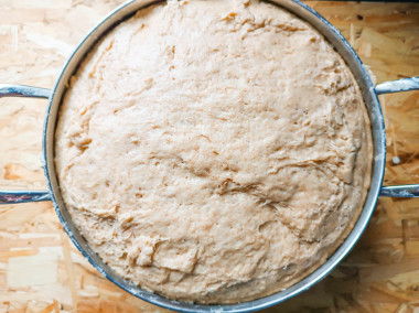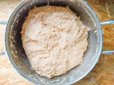 Взять емкость побольше, с учетом подъема теста. Вылить все жидкие ингредиенты, добавить соль, сахар, ванилин и опару. Все хорошо перемешать и всыпая частями муку, замесить тесто. Вымешивайте, пока тесто не начнет отставать от рук и стенок емкости. Поставьте тесто в теплое место и дайте пару раз подойти.