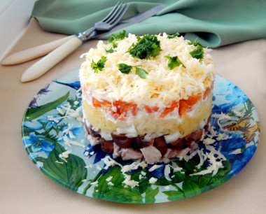 Простой в приготовлении, но очень вкусный и сытный салат с курицей, черносливом и грибами. На праздничном столе займет достойное место. Этот салат покорил всех гостей хорошим сочетанием ингредиентов и отличным вкусом. Любые грибы, чернослив, грецкие орехи вместе все такие вкусные. Благодарю за рецепт.
