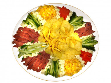 Салат Радуга с чипсами хорош тем, что привередливые гости могут выбрать себе только те продукты, которые им по вкусу. Все остались сыты и довольны!