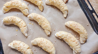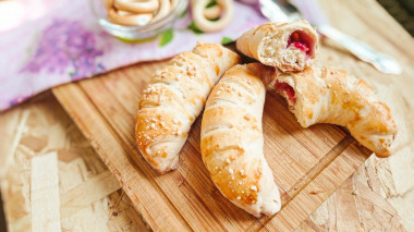 Замесила тесто для булочек на кефире, чтобы приготовить из него что-нибудь к чаю. Кефир использовала жирностью 2,5 процента, яйца категории С1. Муки (с повышенным содержанием белка) у меня ушло около 500 граммов. Тесто получилось эластичное, мягкое, податливое. С ним легко и приятно работать. Испекла из теста рогалики с клубникой. Готовые рогалики получились пышные и мягкие.
