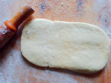Положите на середину теста масло, заверните на него края теста и снова раскатайте тесто в пласт толщиной около 1 см.