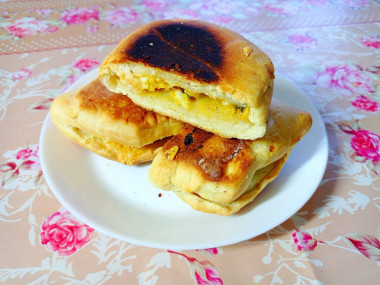 Тесто получилось мягкое, воздушное. перед выпеканием оно ещё ночь пролежало в холодильнике. Булочки я пекла с начинкой из сыра, вареного натертого яйца и зеленого лука. Выпекала их при 200 градусах около 20 минут. Булочки получились мягкие внутри и хрустящие снаружи. Тесто получилось из множества тоненьких слоев.