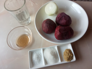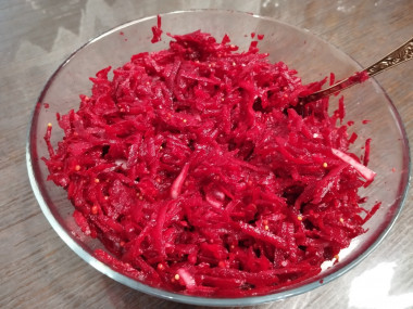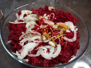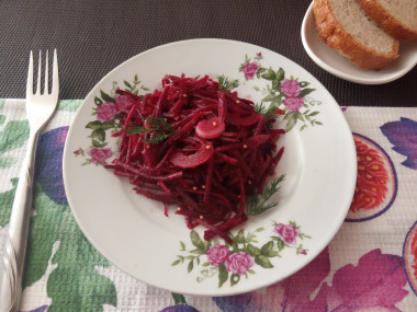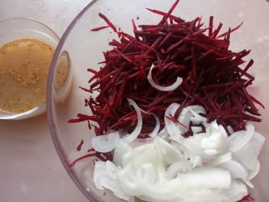Заинтересовал рецепт маринованной свеклы быстрого приготовления. Очищенную свеклу натерла на терке для корейской моркови, лук нарезала полукольцами, смешала всё вместе. В горячей воде растворила соль, сахар, уксус ( я использовала домашний яблочный),добавила туда зерновую горчицу и вылила полученный маринад в натёртую свеклу. Через два часа маринованная свекла была готова. Очень сочная, во вкуснейшем пряном маринаде! Вкусно и как самостоятельное блюдо, и как дополнение к мясным продуктам.Спасибо за рецепт, Жемчужинка!
