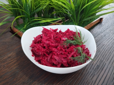 Перемешайте, накройте крышкой или пищевой плёнкой и отправьте в холодильник на час-два. Спустя время свёклу попробуйте на вкус и при необходимости досолите. Наша вкусная маринованная свекла на закуску готова. При подаче можно украсить зеленью.