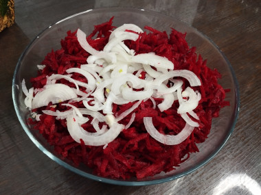 Лук очистите от шелухи, ополосните под проточной водой и обсушите. Нарежьте луковицу тонкими полукольцами или четверть кольцами. Добавьте к свёкле.