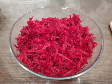 Корнеплоды вымойте и очистите от кожуры. Натрите свёклу на тёрке с крупными зубками. Отправьте в глубокую чашку или тарелку, подходящую по размеру.