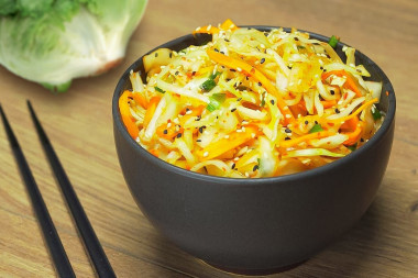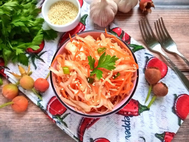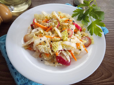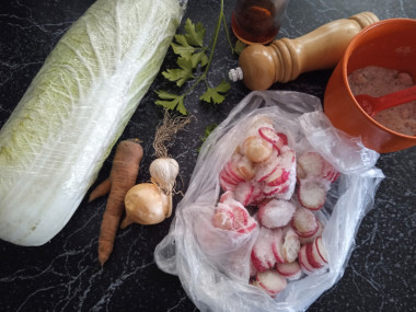 Интересное название меня заинтриговало. Имея в холодильник пекинскую капусту, я решила попробовать приготовить закуску. Взяла этот рецепт за основу. Вместо редьки взяла замороженную редиску, порезанную кружочками. Заправляла салат соевым соусом и бальзамическим уксусом. Капусту нарезала и замариновала по описанию в рецепте в солевом растворе. Морковку нарезала соломкой, измельченный лук обдала кипятком. Капусту промыла от соли в большом количестве воды. Смешав и заправив салат, я посыпала его кунжутом белым и черным. Приготовление несложное. Из специй положила сахар, соль и красный перец.