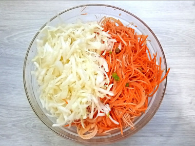 Добавьте к капусте заправленные овощи и хорошо перетрите их руками.