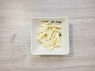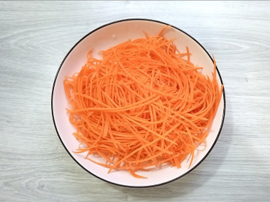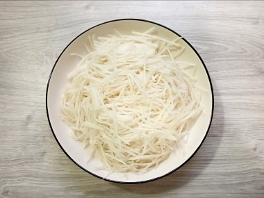 Морковь также нарежьте соломкой. Вы можете натереть редьку и морковь на корейской терке.