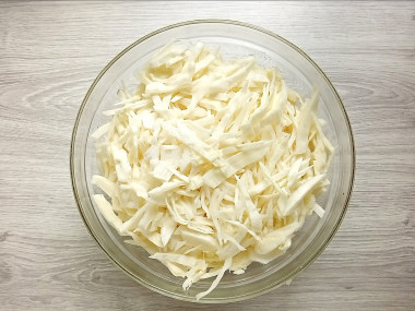 У капусты оборвите верхние листья, отрежьте часть кочана. Помойте и обсушите его. Нарежьте капусту соломкой.