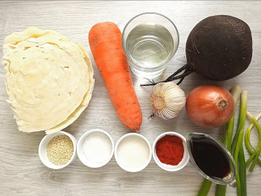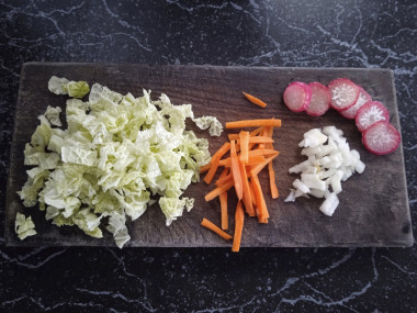 Капусту я постаралась нарезать потоньше. Морковь и редьку (черную) натерла на терке для корейской моркови. Лук нарезала полукольцами, а чеснок соломкой. Заправляла смесью соевого соуса и уксуса. Количество соли и сахара немного увеличила.