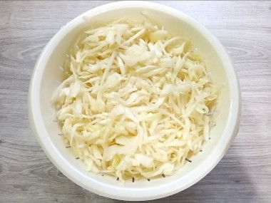 Капусту залейте холодной водой и хорошенько промойте ее от соли. Воду слейте. Повторите это еще пару раз, чтобы смыть лишнюю соль. После последнего раза хорошенько отожмите капусту от воды.